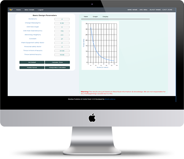 Zone of flyrock travelled is indicated by this estimator. Using safety factors; danger zones for machinery and workers respectively. If it is not possible to remove any structure or person then one can change charging of holes. Inputs to the flyrock software are charge mass, burden, stemming height, and a site constant that lies within a general range that can be tightened by site calibration.
