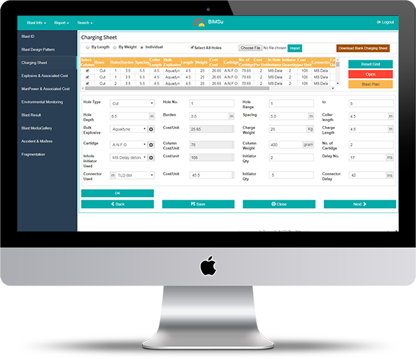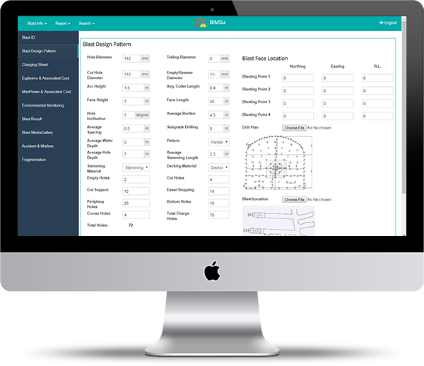 It allows records to be maintained of Blast Design Pattern, Location, Explosive, Initiators Used, Video, Fragmentation Analysis, Vibration Analysis, Accidents and Manpower and Associated Costs. Key performance indicators (KPI) are determined along with End of the month reports for Management,IBM, DGMS and PESO.