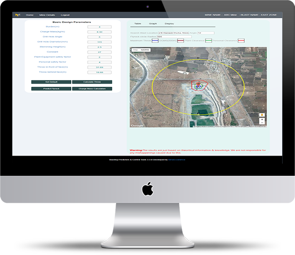 Zone of flyrock travelled is indicated by this estimator. Using safety factors; danger zones for machinery and workers respectively. If it is not possible to remove any structure or person then one can change charging of holes. Inputs to the flyrock software are charge mass, burden, stemming height, and a site constant that lies within a general range that can be tightened by site calibration.