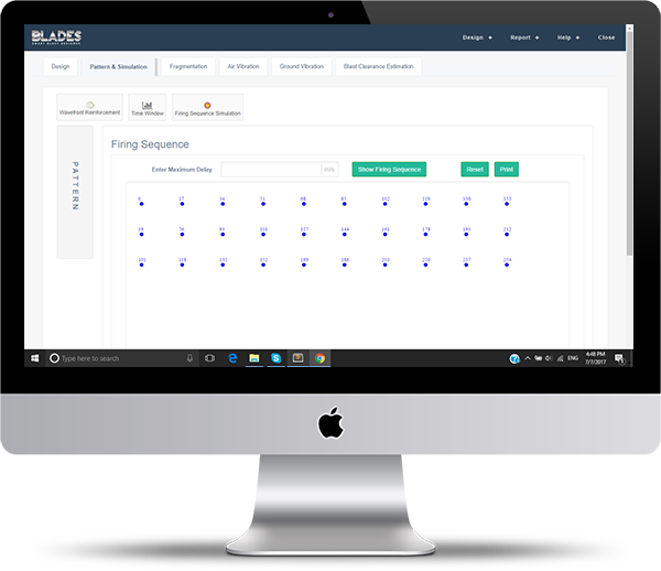 Generates blast plan and according to the delay pattern structure, simulation. BLAst DESigner Software (BLADES) calculates blast plan parameters, explosives charge distribution, initiation timing and sequence, results in terms of rock breakage and fragment size distribution.