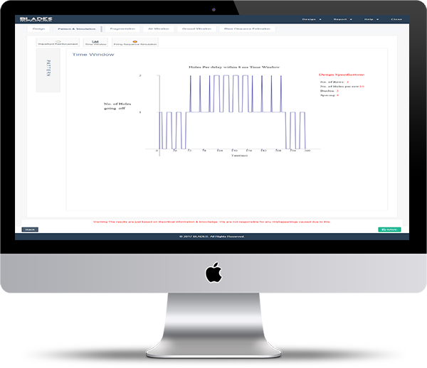 Generates blast plan and according to the delay pattern structure, simulation. BLAst DESigner Software (BLADES) calculates blast plan parameters, explosives charge distribution, initiation timing and sequence, results in terms of rock breakage and fragment size distribution.