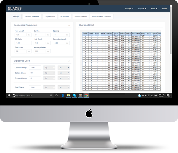 Based on desired blasting inputs such as face co-ordinates, hole diameter, pattern layout, face rock characteristics and location, face profile, hole diameter, pattern layout, desired fragmentation size, explosives and initiating devices, environmental constraints, BLAST DESIGNER SOFTWARE (BLADES) calculates blast plan parameters, explosives charge distribution, initiation timing and sequence, results in terms of rock breakage and fragment size distribution.