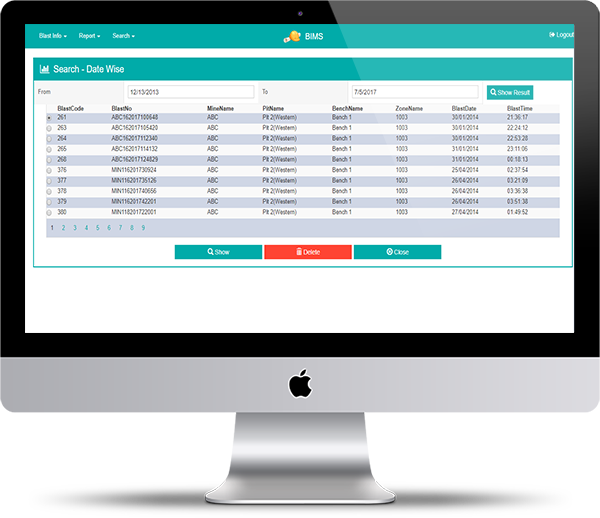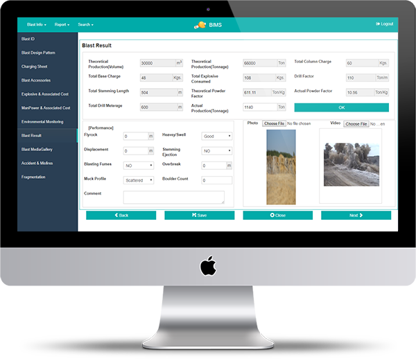 Blast Information Management System (BIMS) provides information to meet the strategic and operational needs for planning, controlling and decision making for optimizing mining operations. BIMS provides methods to store, manage, document and retrieve drill and blast related information. The system stores blast details, actual blast parameters, blast pattern, face profile, explosive consumption, charging details, vibration records, photos and videos of the blast.