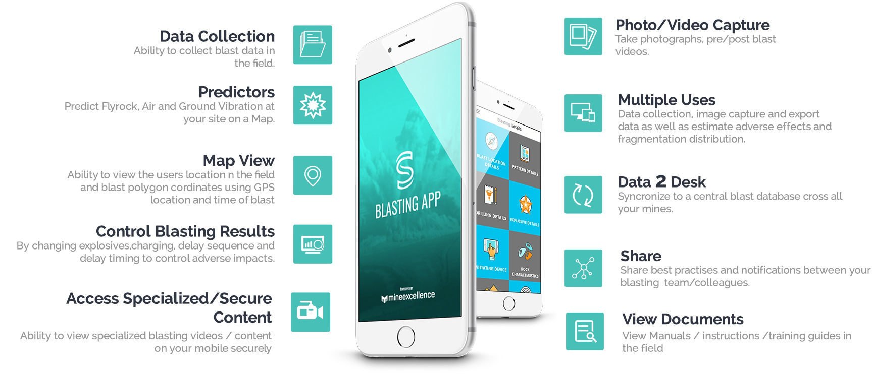 Smart Blasting App is an end-to-end technology framework for collecting data in the field and then transferring it to server or desktop computer. In addition to data collection; the SBlasting App also includes environmental predictors, thus analyzing the environmental hazards using the filled data before a blast, thus improving operational efficiency.
