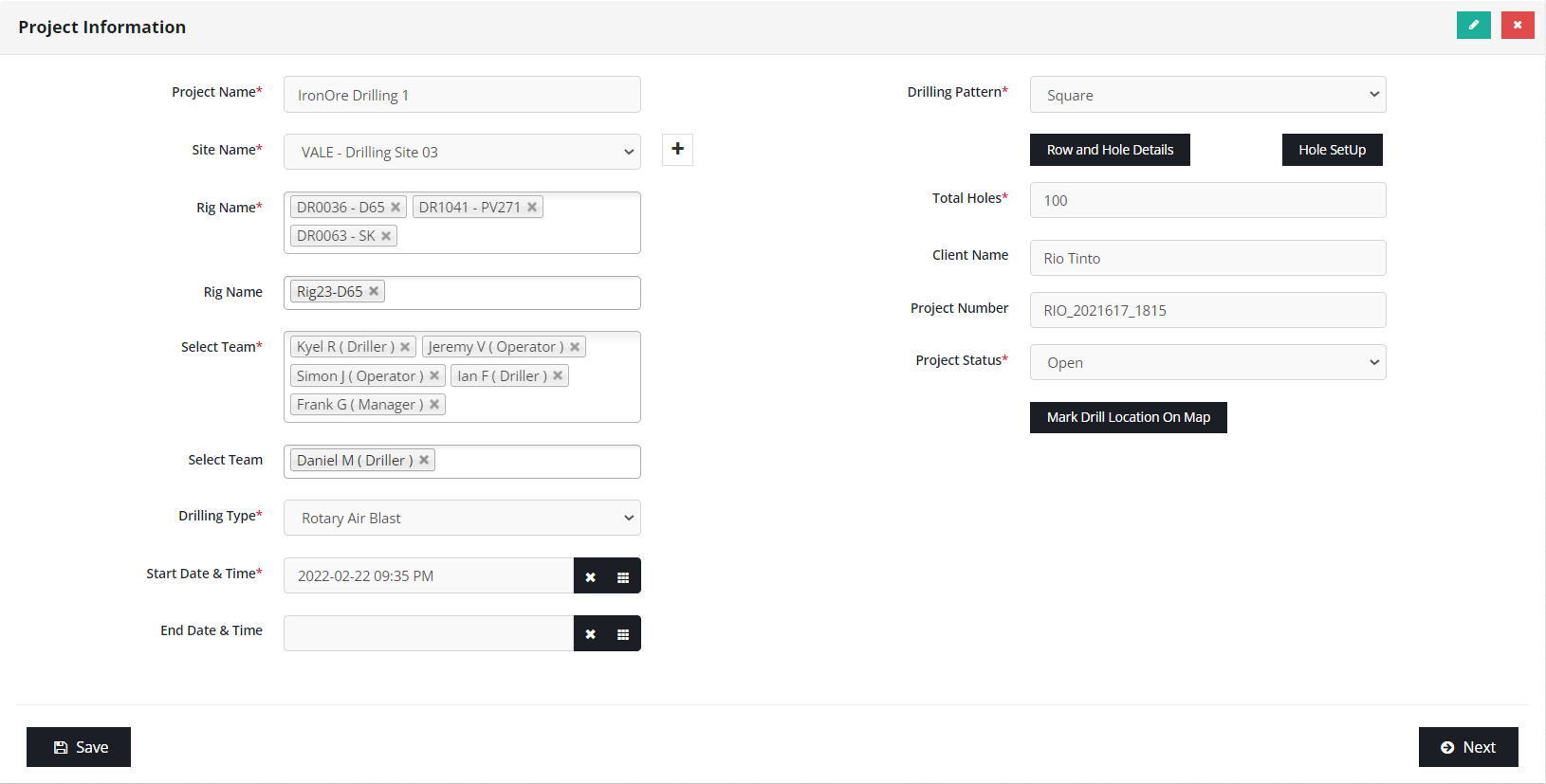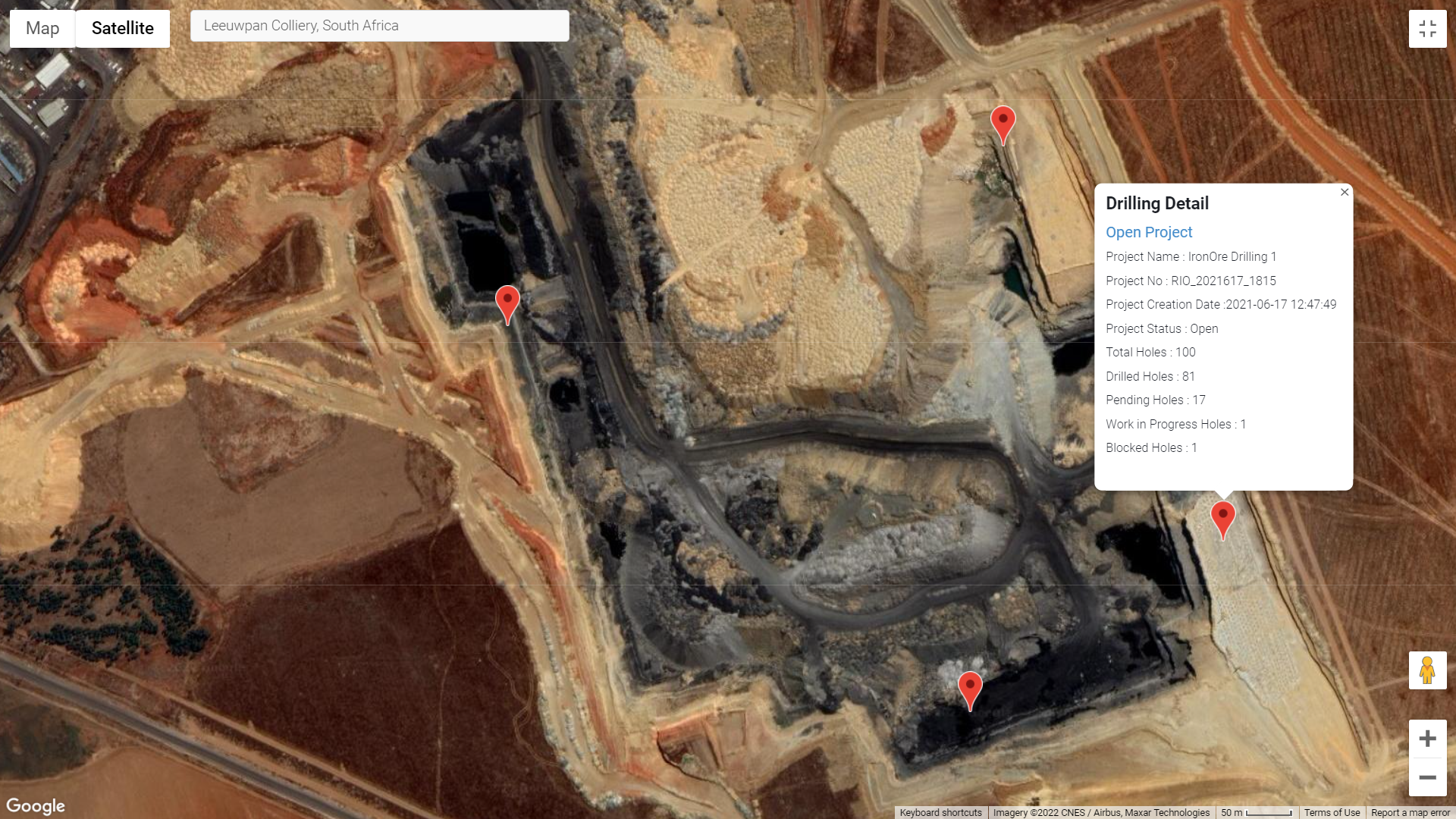 Ability to monitor the entire drilling operation in real time on map. Information like drilling progress, project status, no of (drilled, blocked, pending) holes & much more information in real time and easily accessible.